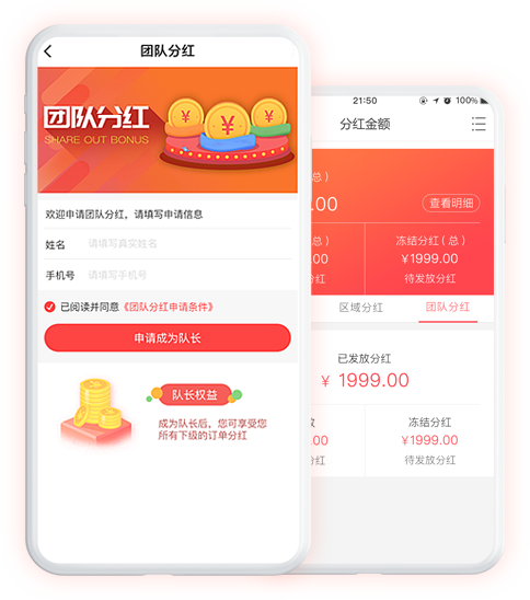 分销团队中,符合条件的团队队长,可在分销佣金之外,额外获得整个团队订单总额按一定的比例的团队分红。团队分红有利于激励团队各成员积极为商城宣传,促进商城交易激增,成就精英团队,网红商城。