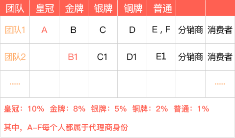 A,B1,C2都是金牌代理的情况下,A可以拿到团队1下面的所有分销商的业绩分红,B1拿到团队2下面的分销商分红,C2拿团队3的分销商业绩分红